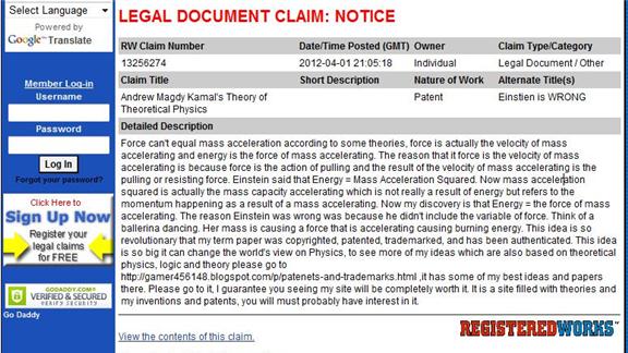 I certainly don't have the command of physics knowledge I once did, but I do know that Einstein's theory has been challenged before. A Google search can tell us that. The website used to register this theory does not cross-reference the work being submitted and gives no recommendation as to the validity of the contents being uploaded there -- the record merely states that the theory must be patented, not correct, so it is a record, whether the theory is acceptable or not.